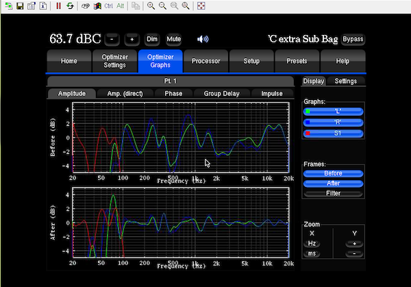 After measuring the room with bursts of white noise (You can see the result in this screenshot: red marks the frequency of my subwoofer, blue and green are the left and right speaker) and a specially developed 3d microphone with 4 omnidirectional capsules its intelligent acoustic analysis engine automatically computes FIR (finite impulse response) and IIR (infinite impulse response) filters to dramatically improve the consistency of direct sound against late reverberation. Full-phase, time domain techniques are applied compensating for the loudspeaker’s group delay and for very early reflections (deconvolution), while later reflections are left untouched.