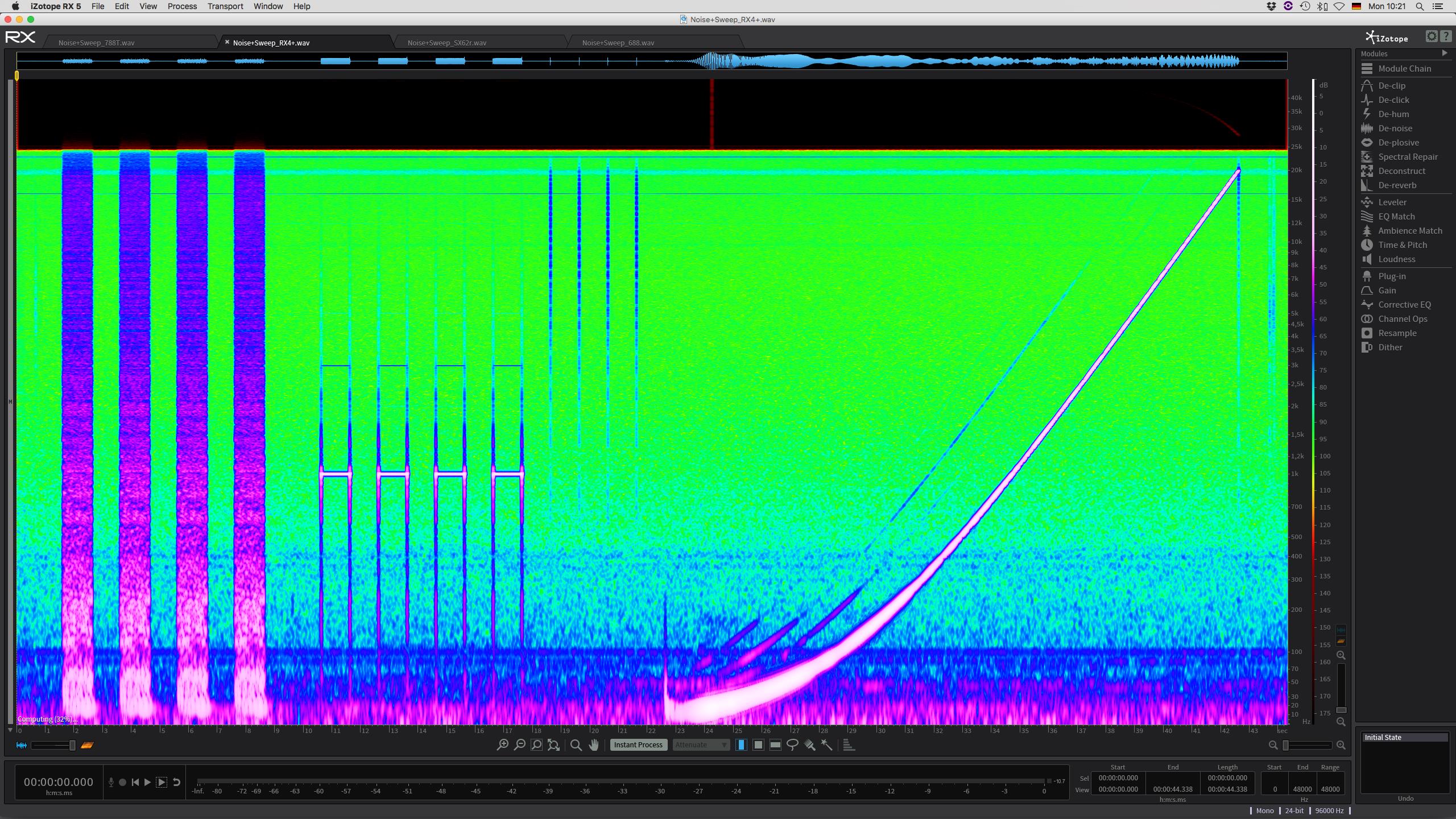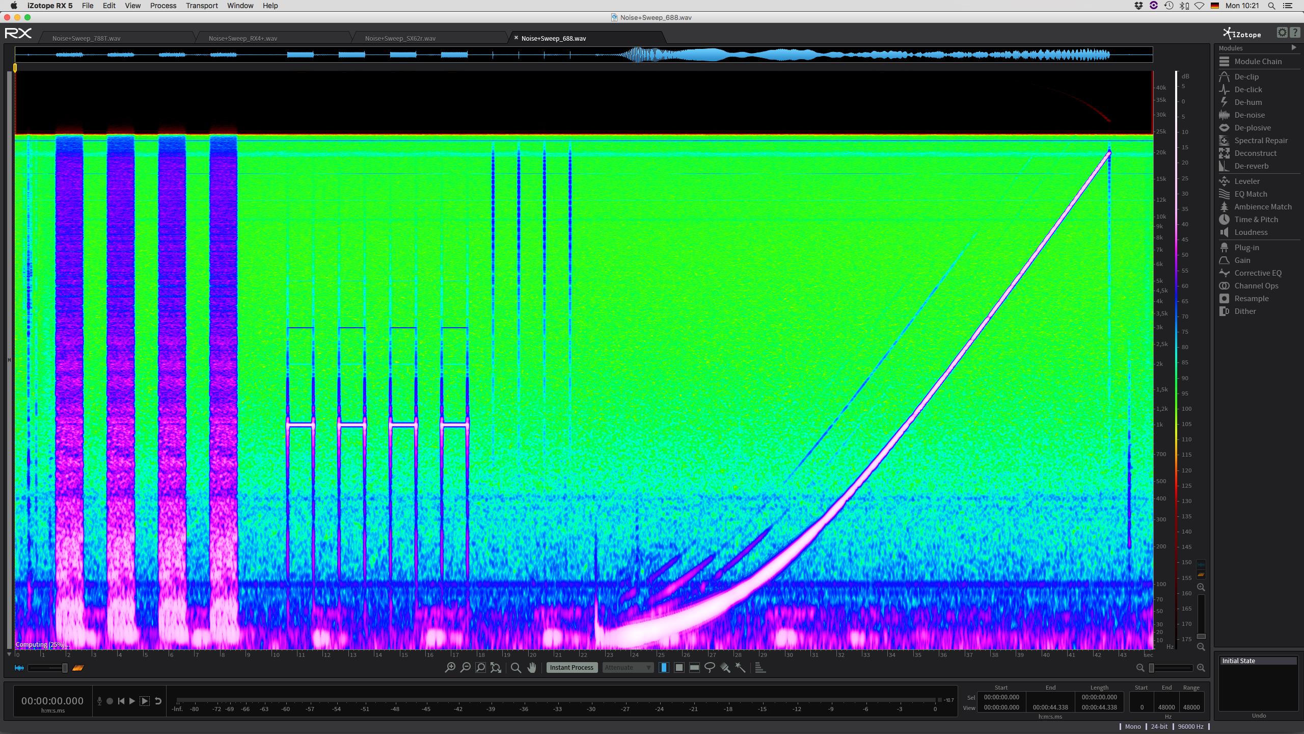 A little side-note: I did the test with a stereo matched pair of DPA4007. Those microphones have a very low sensitivity and a very high 159 dB of max SPL. So there is a bunch of noise coming from high gain settings on all recorders, but this is the only matched pair that I had around during the test. I tried to get the same gain levels as precisely as possible to record some white noise, sweeps, clicks using the same microphone and cable at the same spot played back by the same speakers to get a clear first sound impression. I don’t want to show those off as soundcloud links or similar here. Simply download the test files and find them in there. Interesting enough: All recorders are very different. Getting too hot into the recorders during the sweep was to check the limiters on the 62r vs the 744T and the Dual AD conversion which should not make a limiter necessary on the R4+. Since I recorded at 192kHz there were no limiters available on the 688 and no Dual AD conversion either.