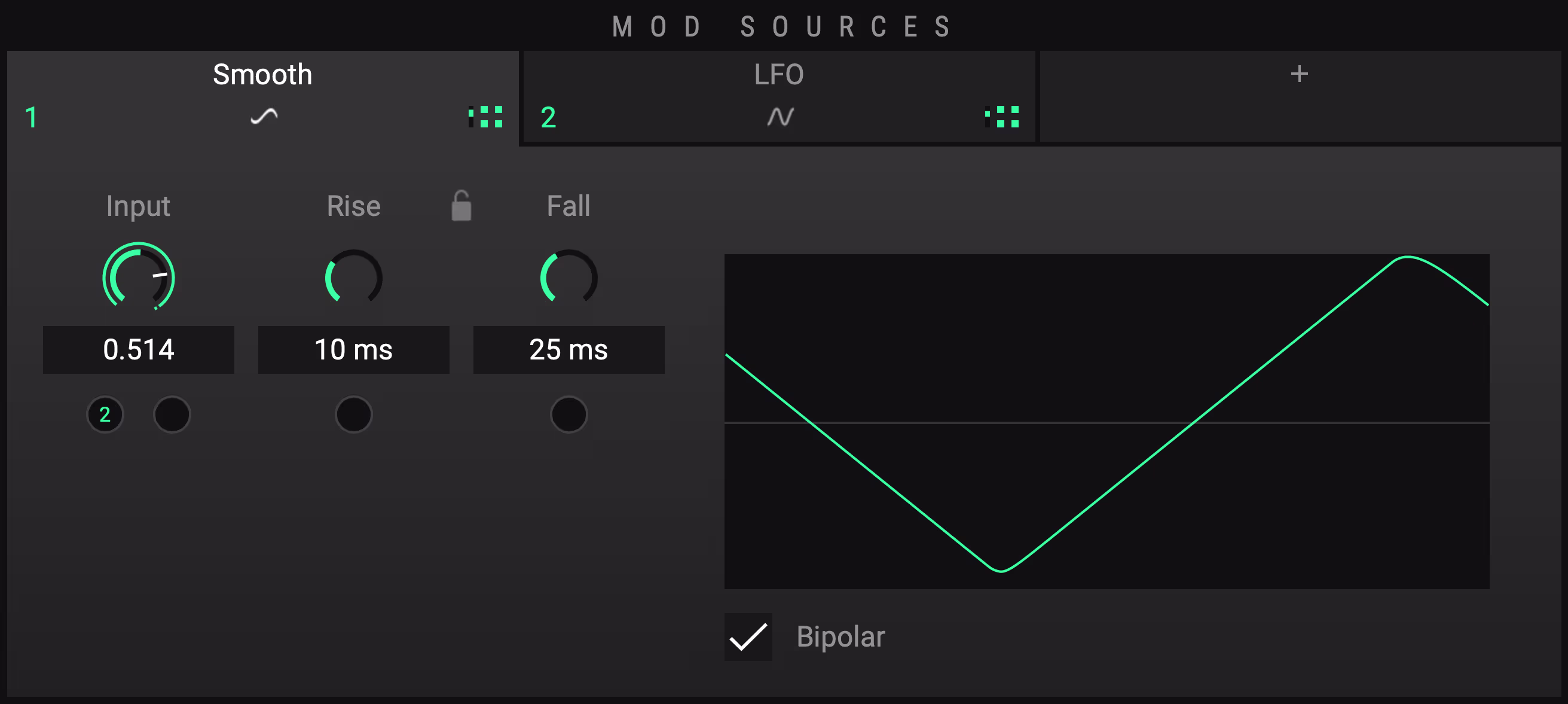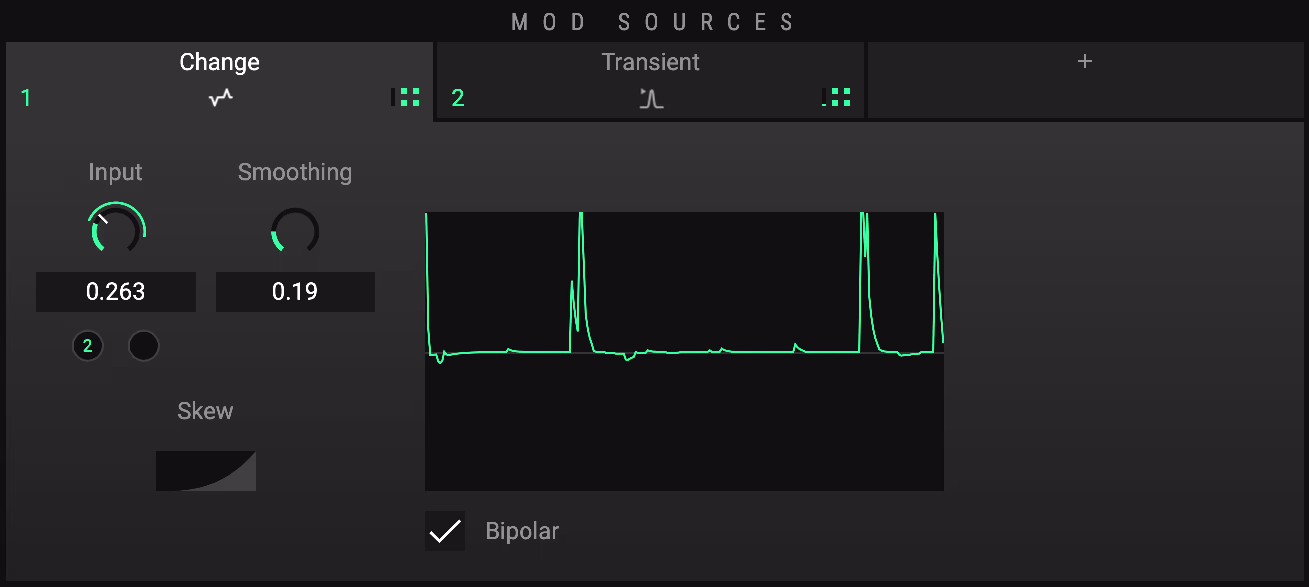 The CONTROL section offers several modulation sources as well. You can simply apply any given parameter the same way you would apply a modulation value from the MOD SOURCES section. You will find a detailed explanation on how to do so in the following chapter. Gate will output either 0 or 1 depending on the trigger state. In MIDI mode this will represent the note on/off state. You can also use information deriving from Velocity, Key, Pitch Bend or your Modulation Wheel / Foot Pedal / etc. Once you have applied these modulation values you can still switch back to audio-triggering and make full use of all the options offered within this section.