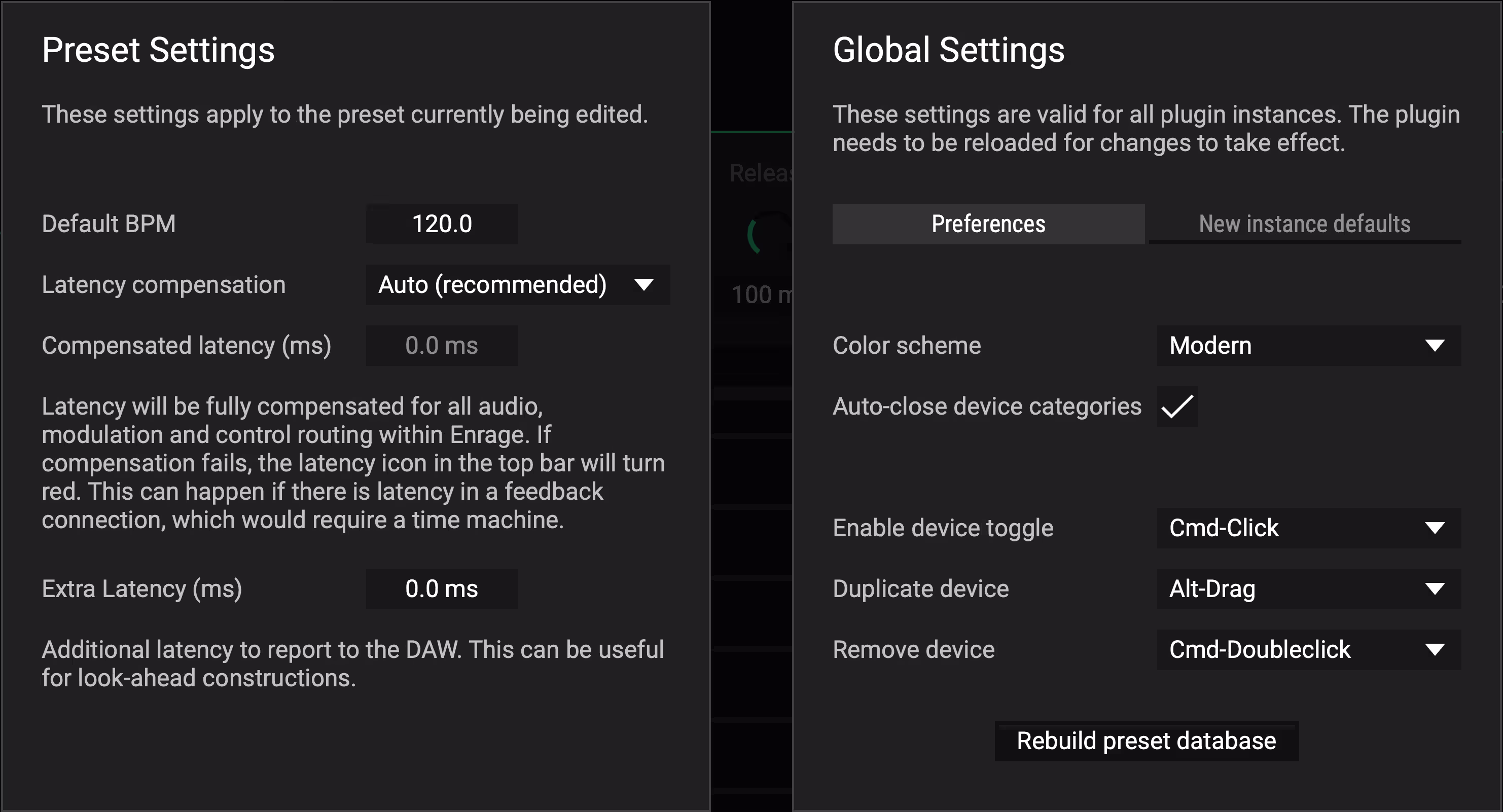 Within the Preferences tab you can make general adjustments that affect all instances of this plugin such as Color scheme (Modern - Classic - Colorblind) and usability optimizations. By clicking on the Rebuild Preset Database button on the bottom, ENRAGE will scan all Preset Directories and update your Preset Browser. You can also change the default modifier keys for the following actions: Enable device toggle, Duplicate device and Remove device.