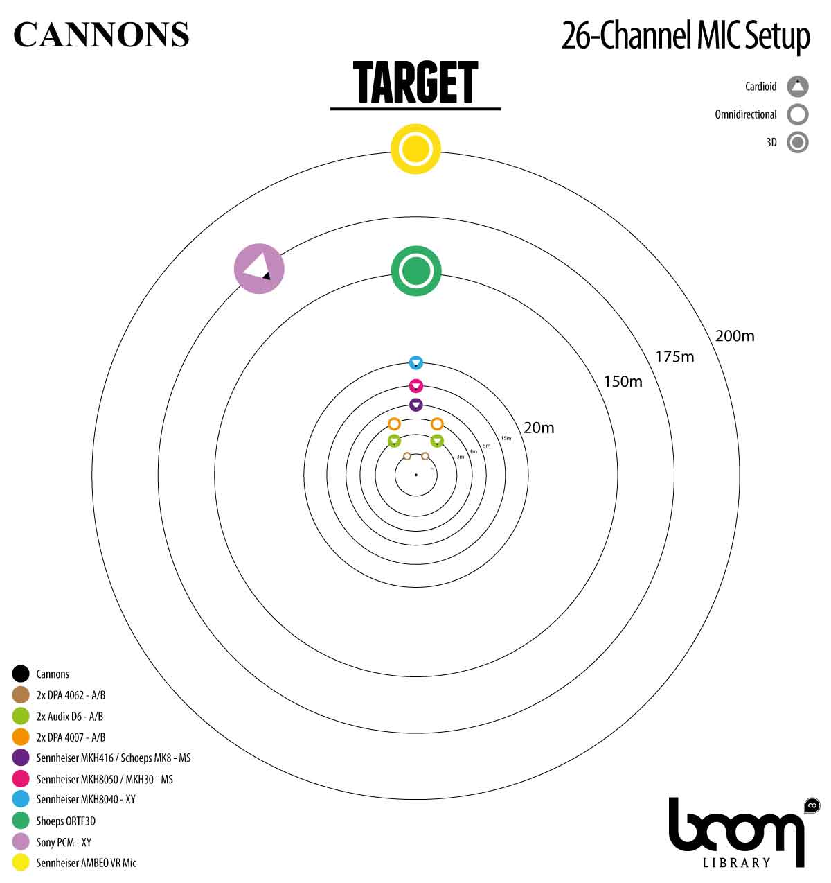We used a 26-channel microphone system to record CANNONS. This wide placement allows you to put the point of view almost anywhere in relation to the firing cannon. The 26 distinct channels are only available in the Construction Kit. In the Designed edition, we used various combinations of the 26-channel array to craft ready-to-use sounds in a variety of styles.
