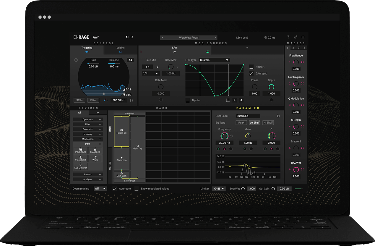 Unlimited options. A wide range of devices. Extraordinary mod sources. The only barrier is your imagination. Combine any effects, create routing chains as simple or complicated as you need. Choose from over 50 devices, click and drag them into the rack, and change the parameters. ENRAGE’s modularity allows interacting and interwoven effect structures that cannot be achieved with typical serial effect chains. Expand the possibilities by simply dragging and dropping macro assignments to take further control.