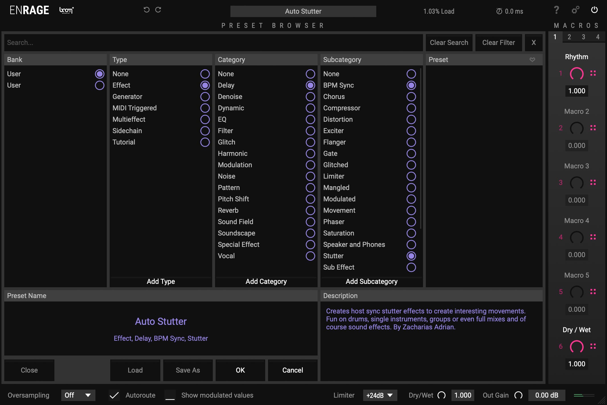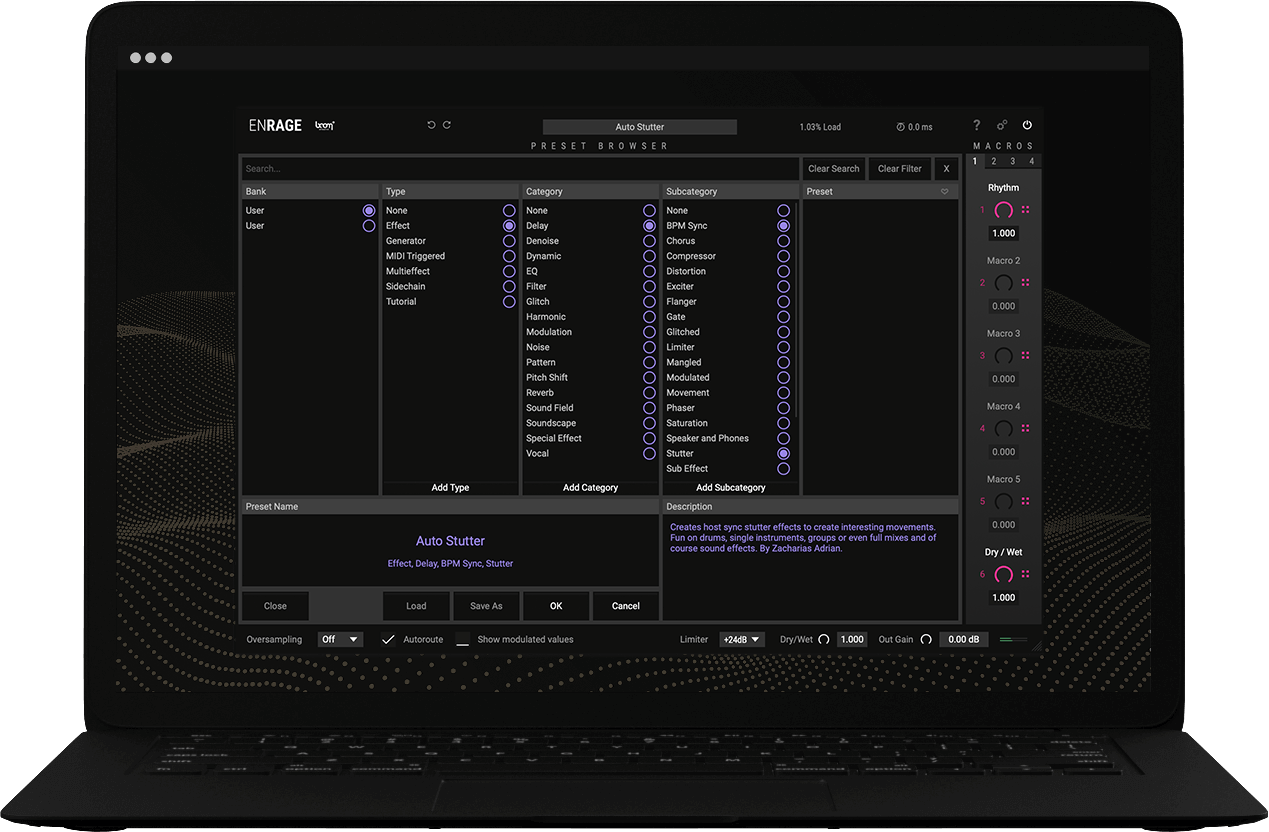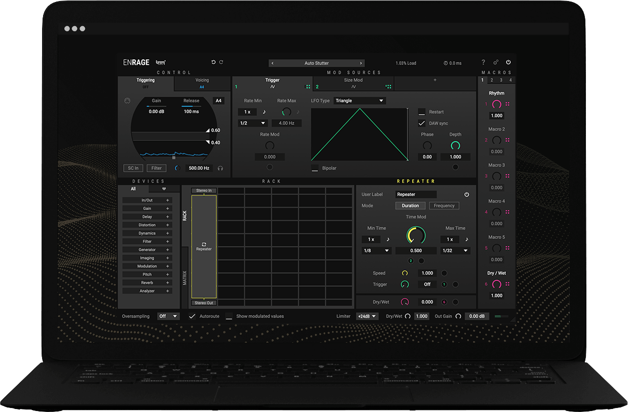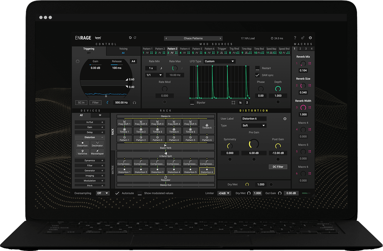 ENRAGE is working smoother than ever under the hood. With automatic internal latency compensation, all the effects and modulation within ENRAGE are synced automagically if needed, so that everything stays in syn in your preset and in your DAW. Working with any device that introduces latency was never so easy.